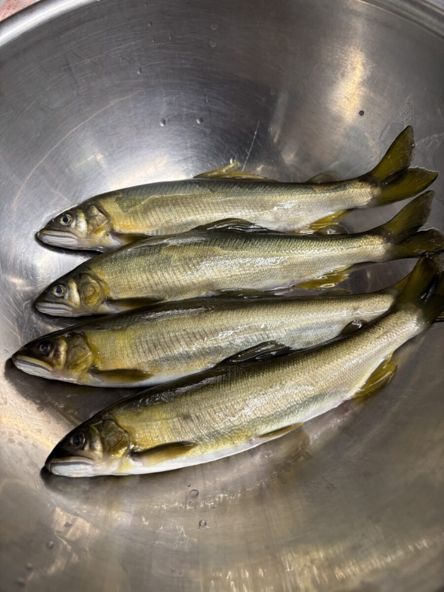 『子持ち鮎』は9月の下旬から10月の中旬ぐらいに出回る産卵期の鮎です。釣り人の間では産卵のために川を降るため『落ち鮎』の名前でも知られており、この時期にしか味わえない貴重な旬の味です。