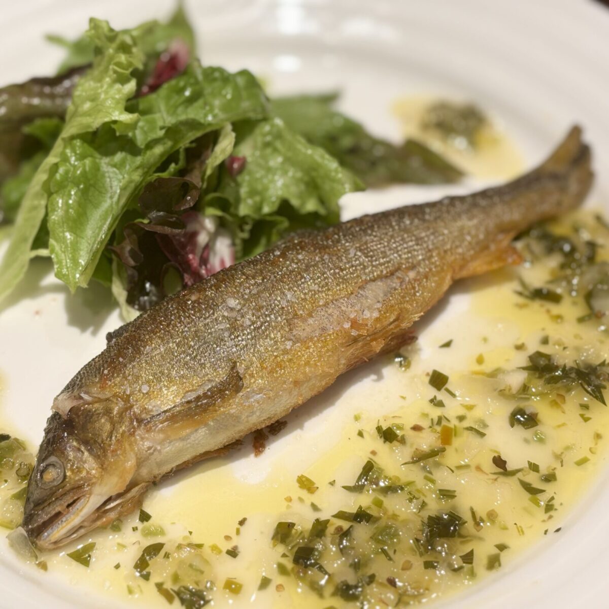 表面をカリッと香ばしく焼いてそのままで、また途中から青唐ソース(酸味の効いた青唐辛子とハーブのソース)でいただいても美味です。頭も中骨も柔らかく煮あげてありますので尾頭付きの鮎丸ごと召し上がってください。
