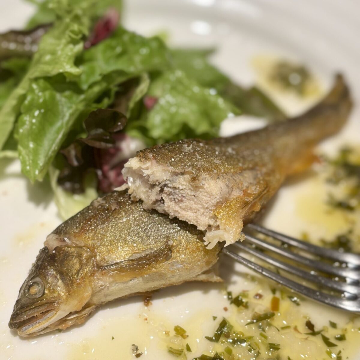子持ち鮎のコンフィです。コンフィは元々は保存を目的としたフランス料理の調理法です。素材を油脂の中で低温で煮て熱により殺菌し、そのまま油脂につけて保存します。油脂に漬け込んであるので食材の酸化も防げるという冷蔵、冷凍技術がない時代の知恵でもあります。